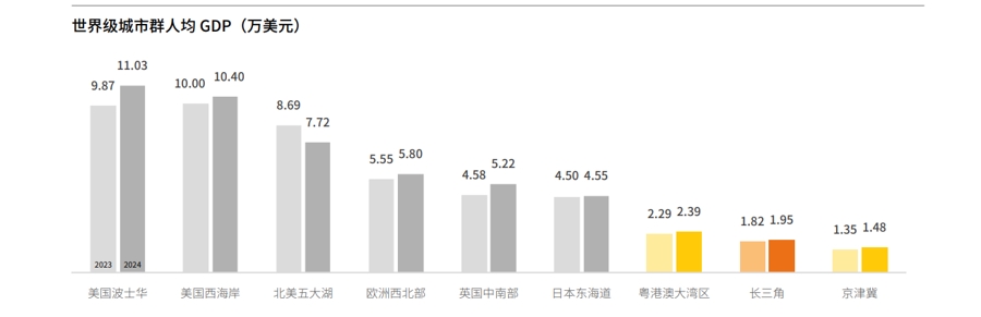 结合权威学术定义和官方规划范围,识别并划定北美第五大湖、美国波士华、美国西海岸、日本东海道、英国中南部、欧洲西北部、长三角、京津冀、粤港澳大湾区9大世界级城市群。2024年,长三角GDP总量4.65万亿美元,规模继续保持第2,仅次于美国波士华城市群。