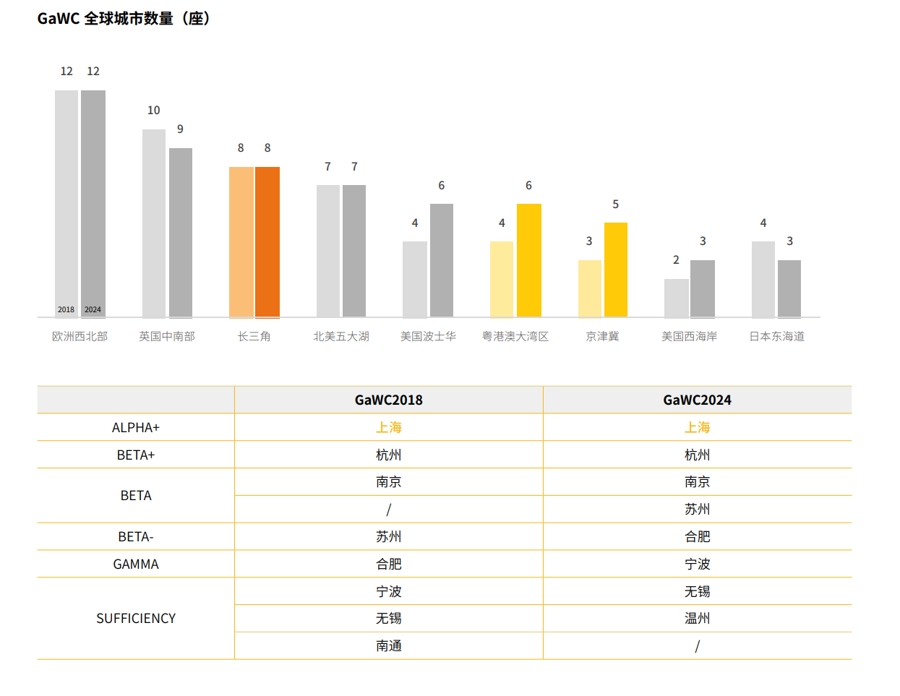 核心城市是城市群发展的动力源。2024年,长三角8座城市入选GaWC世界城市榜单,数量仅次于欧洲西北部、英国中南部城市群。8座城市分别为上海、杭州、南京、苏州、合肥、宁波、无锡、温州,温州为首次上榜,苏州、合肥、宁波在城市能级上均有进位。