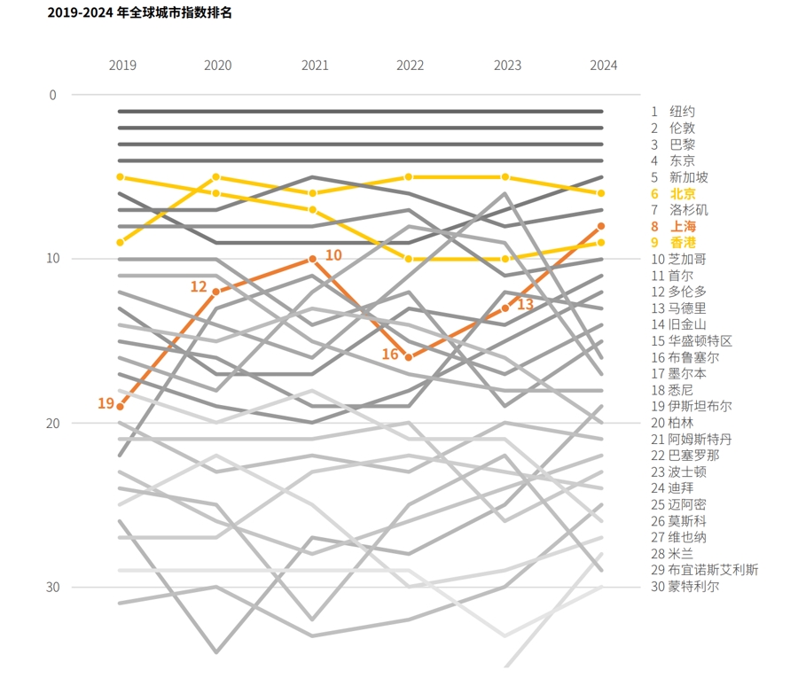 其中,上海作为长三角城市群龙头,城市能级进一步提升。上海2024年排名大幅上升至第8,首次超越香港。