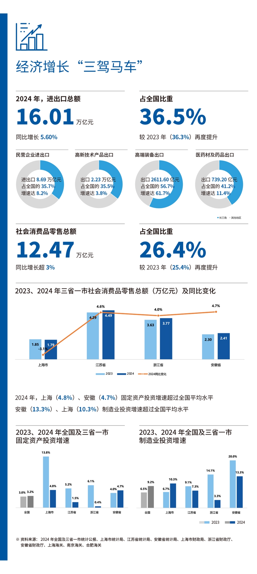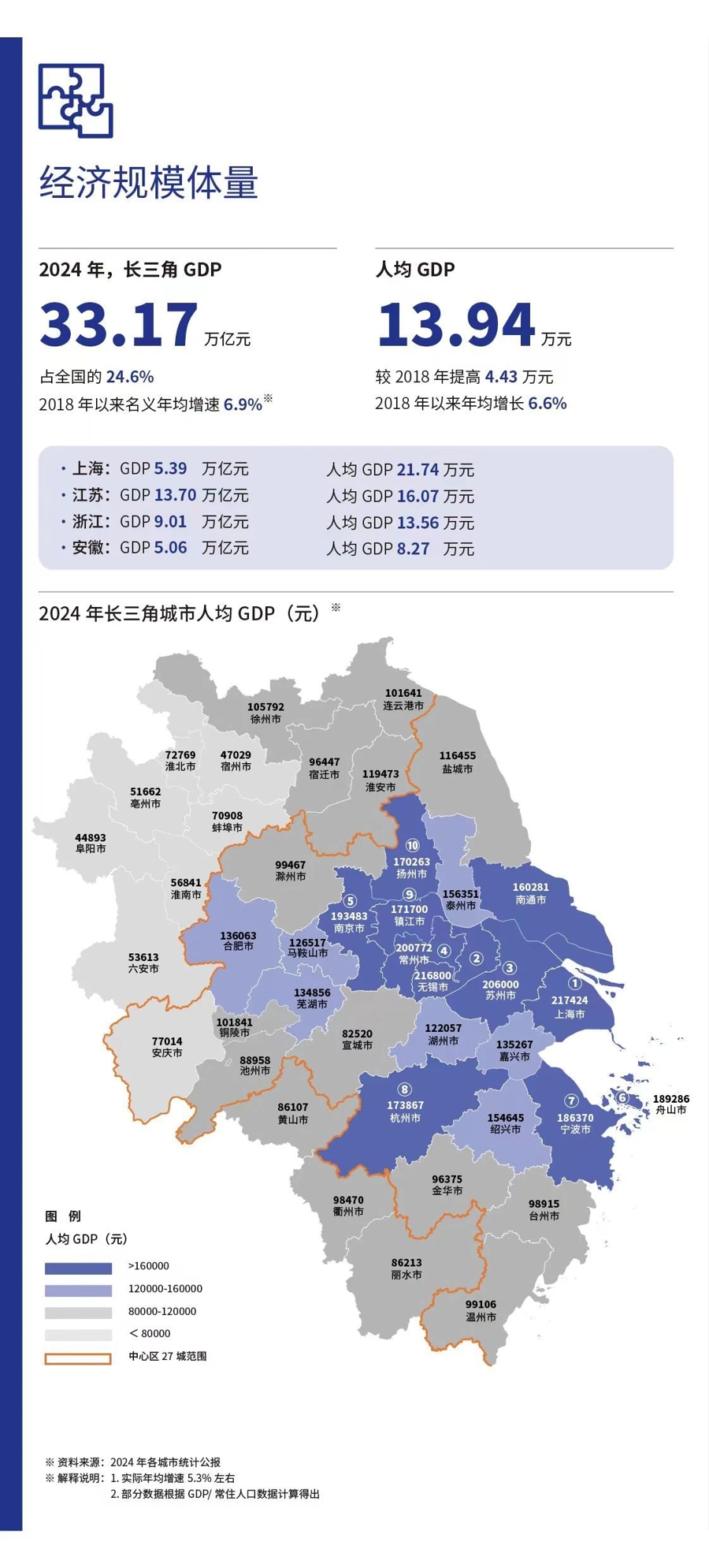 2024年,长三角地区经济总量突破33万亿元,以仅占全国4%的国土面积,创造了全国近1/4的经济总量,集聚了全国约17%的人口,对全国经济增长的贡献率约为30%。自2018年长三角一体化发展上升为国家战略以来,取得诸多成果,是我国经济发展的压舱石和动力源。