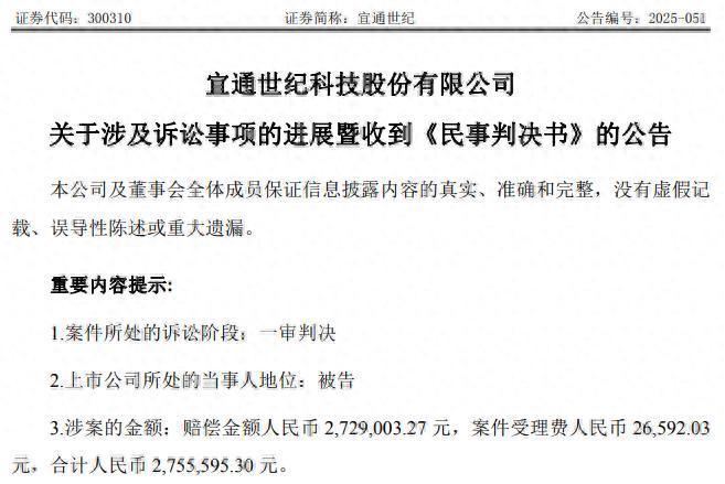 12月30日晚间,宜通世纪(300310)公告称,公司当日收到广东省广州市中级人民法院关于证券虚假陈述责任纠纷案的《民事判决书》。法院一审判决公司向原告陈*华、阮*良等109名投资者赔偿投资损失人民币2,729,003.27元,并承担案件受理费人民币26,592.03元,合计人民币2,755,595.30元。