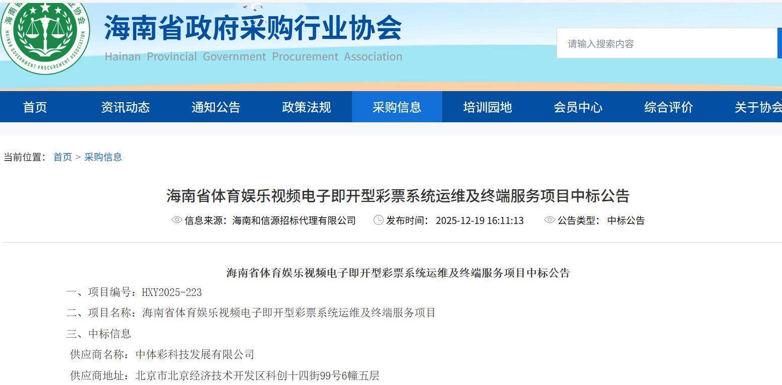 2025年12月19日,海南省政府采购行业协会网站发布的《海南省体育娱乐视频电子即开型彩票系统运维及终端服务项目中标公告》显示,中体彩是唯一中标方。根据招标文件,该招标的服务年限为3年。
